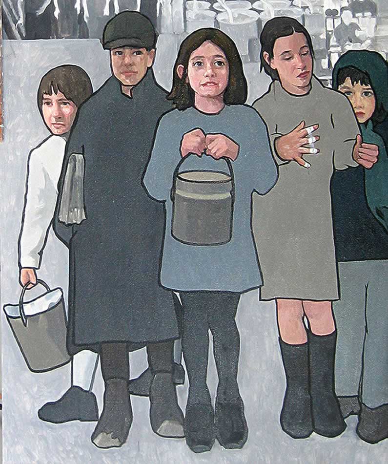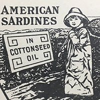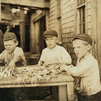 This panel’s foreground depicts children working in the sardine industry. Beginning in 1875, entire families worked together in the canneries for “the season,” lasting from April to December. The fish canneries were located along the Maine coast and drew workers from surrounding towns. August launched the busy season. Boats loaded with herring arrived early each morning. Work in the busy season extended from dawn to well into the night. In 1907, Maine’s Department of Labor reported that children could come and go from the work place as they wished, but many children worked long hours. While workers received decent wages, their income depended on "the catch." The more fish, the more work. Companies paid workers by the piece, whether that meant gutting an endless pile of fish to fill a box or packing a can of processed sardines.