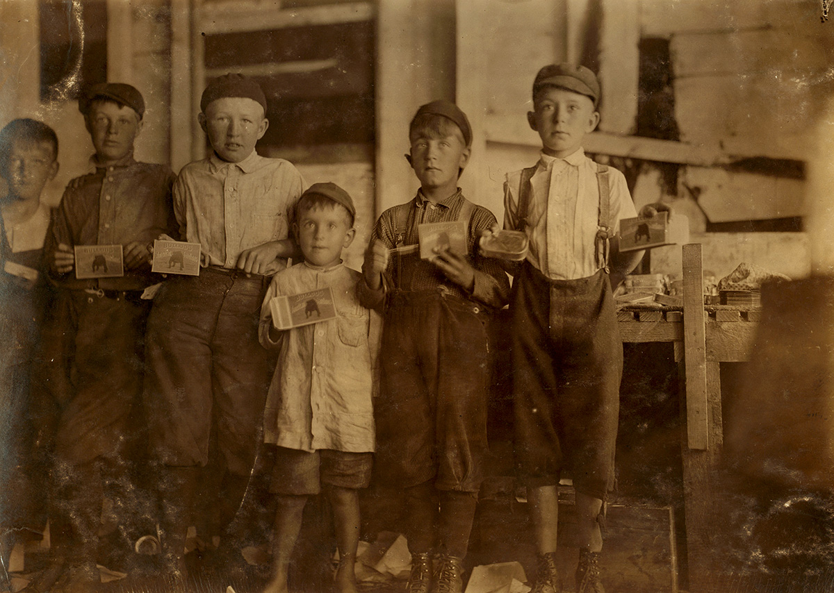 Some of the young cartoners, including five-year-old Preston. Photograph by Lewis Hine, Eastport, Maine, August 1911. Courtesy of the Library of Congress.