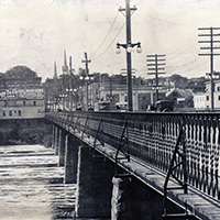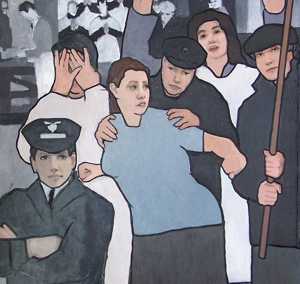 The following day, 1,000 workers marched across the bridge from Lewiston to Auburn. This panel depicts the mass demonstration, later known as "Red Wednesday." When police grabbed a female worker, chaos erupted. Using tear gas and clubs, the police pushed the crowd back to Lewiston. Governor Lewis O. Barrows sent 400 National Guardsmen to join the Auburn and Maine State Police. Authorities arrested the CIO leaders, held them without bail, and sentenced them to six months in prison. The companies hired replacement workers or "scabs."