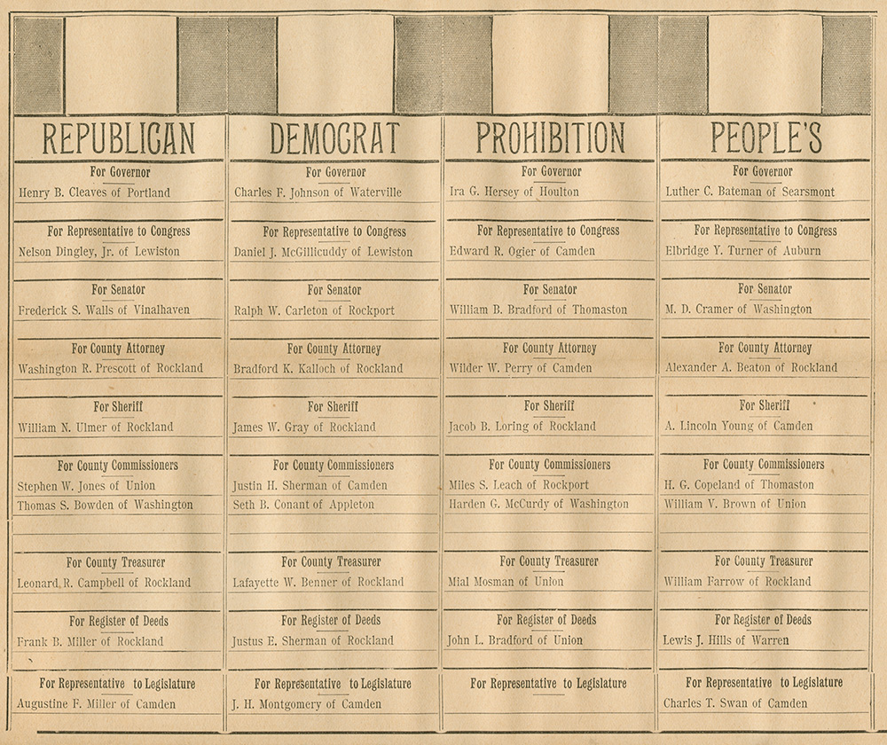 This ballot is from Camden Maine in 1894, an early example of the secret ballot law in effect. The ballot lists state and county candidates in four political parties.
