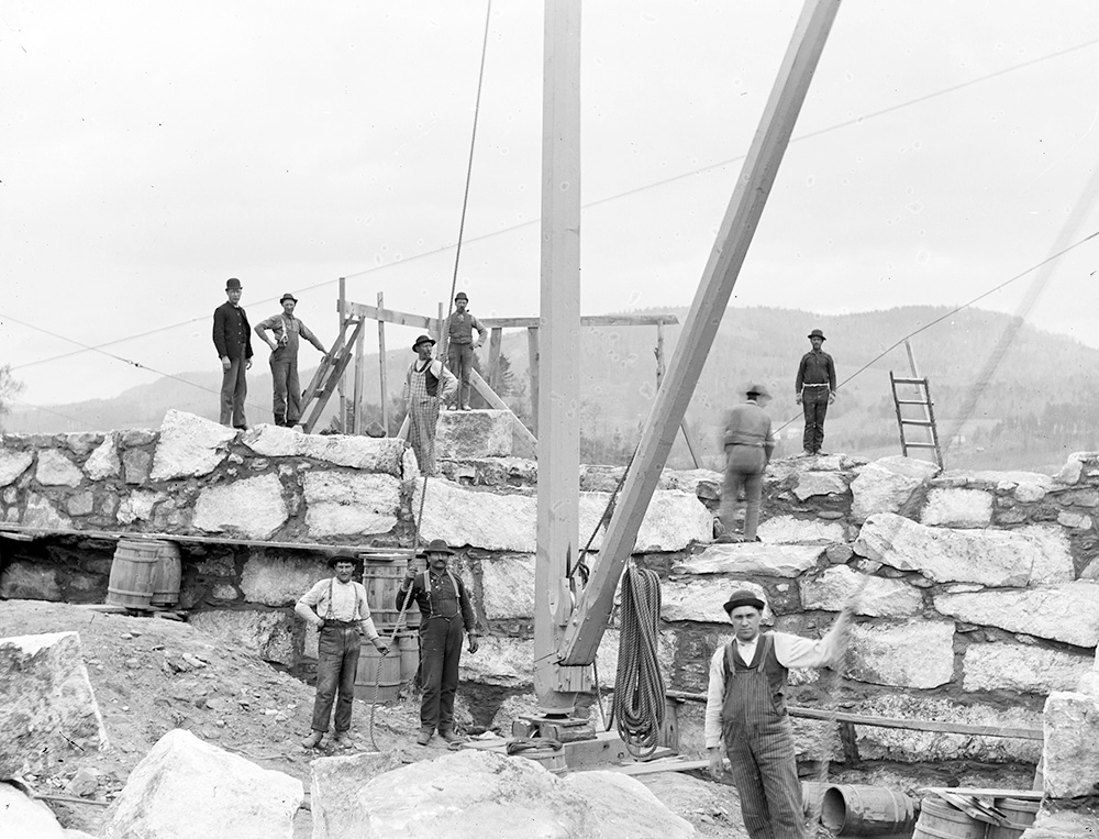 The workers in this scene stand in front of a derrick that operates like a large crane to move massive granite blocks. As stone masons, these men appear to be laying stones for a foundation. This photograph was taken in the Rumford, Maine area. In 1892, the International Paper Company opened a pulp and paper mill in Rumford Falls, Maine. Stones of this size could well have been used for the foundations of the mill buildings there.