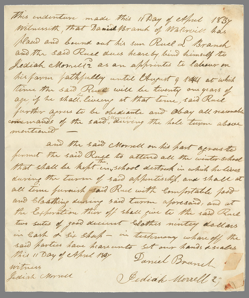 Indenture of Reuel Branch, Waterville, Maine, April 11, 1837. Maine State Museum. Gift of George F. Terry, III, 90.99.2.