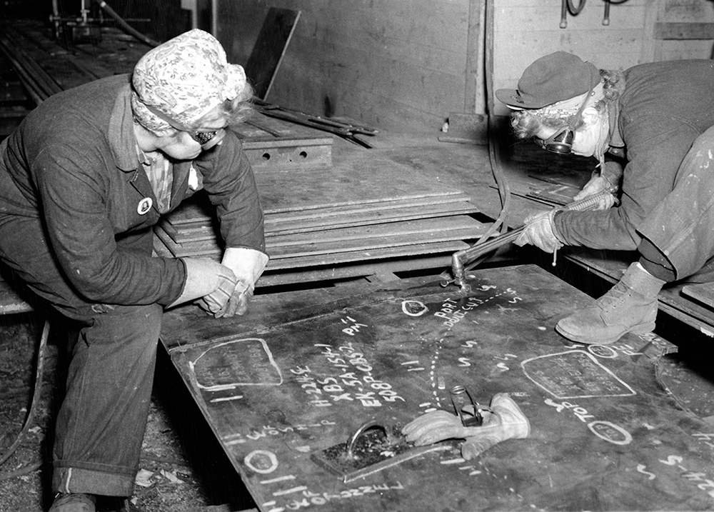 "Burners" Winona Birmingham and Martha Cunliffe cut openings in steel according to the instructions painted on steel plates. The plates could then be pieced together to form such components as decks and bulk heads of destroyers. Shipyard management expressed their amazement at women's ability to master such "skilled operations [which] often involved their diligence, accuracy and patience on repetitive jobs."