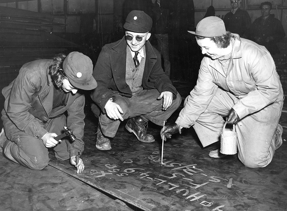 Jim Flaherty of the South Portland Shipbuilding Corporation is pictured training Arlene Bryant of Saco and Dorothy York of Lewiston to paint precise marks from a ship's blueprints onto steel plates. In the next stage of production, welders will cut the lines to create ship components. Single and married women with or without children worked all three shifts at shipyards in Maine. Arlene Bryant had two teenage boys at home in the years she worked in the South Portland shipyards.