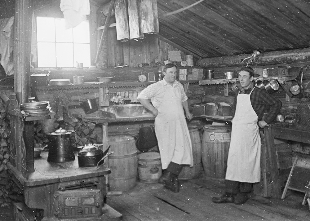 By 1910 the Maine Department of Labor boasted that lumber company cooks fed the men fresh meat, vegetables, dried fruit, and other foods of "excellent quality." As seen in this photograph, camp kitchens modernized with cookstoves and equipment to cook a wider variety of foods.