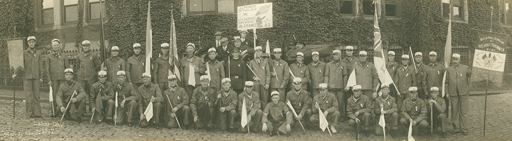 As these union members prepare for Portland's 1918 Labor Day Parade, they remember their friends serving in World War I. A man in the back holds a sign with a painted American soldier and flag that reads: "32 Members Of This Lodge IN U.S. SERVICE SOMEWHERE IN FRANCE"
