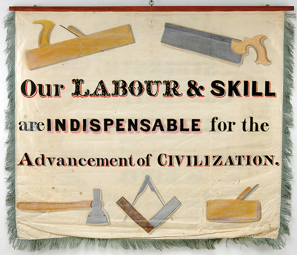 Men working as house wrights (carpenters) carried this banner in an 1841 parade in Portland, Maine. The Maine Charitable Mechanic Association staged the event to promote the value of mechanics (skilled craftsmen) from a variety of trades.