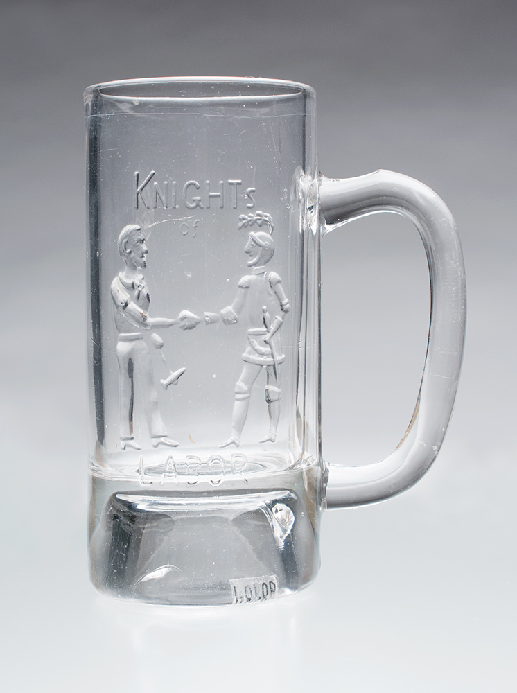 This mug shows a knight shaking hands with a hammer-carrying worker, celebrating the ideals of the Knights of Labor union. By 1887, the Knights claimed 127 chapters and 27,000 members in Maine.