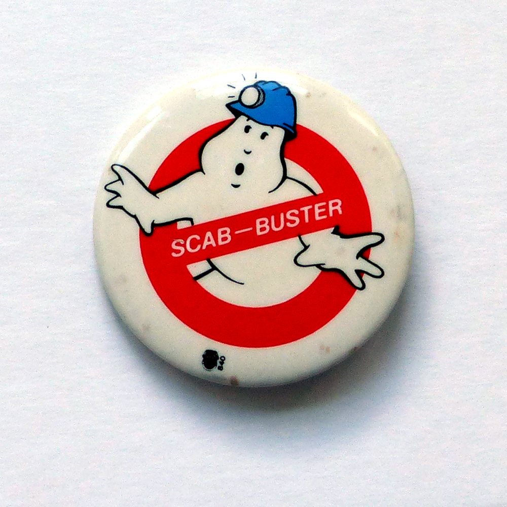 This protest button is playing on Ghost Busters, a popular movie in the 1980s. It was worn by a supporter of the strike. A "scab" is a disrespectful name for a replacement worker.