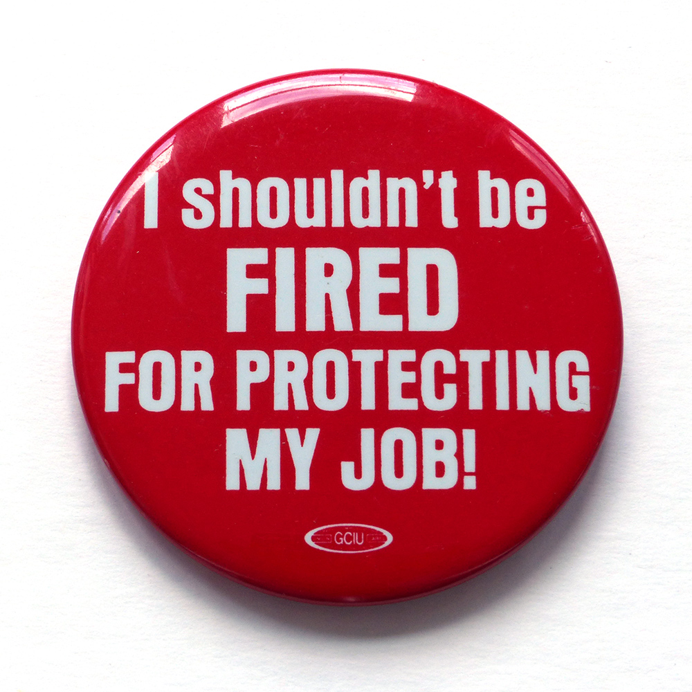 "I shouldn't be FIRED for PROTECTING MY JOB" button, 1987. Courtesy of the Maine Paper and Heritage Museum.