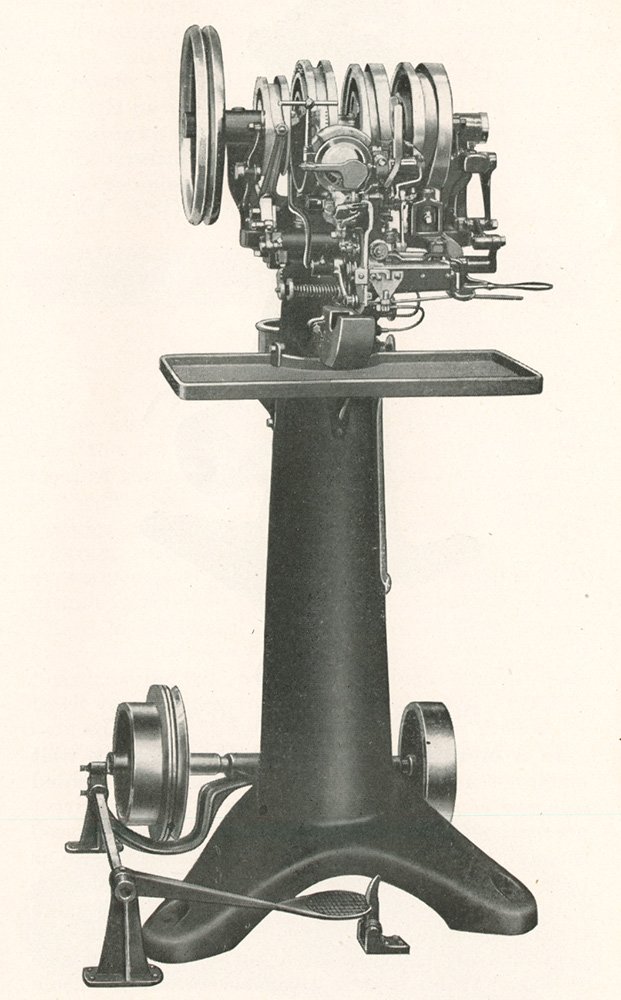 Universal Outsole Rapid Lock-Stitch Machine, illustration by Universal Shoe Machinery Company, St. Louis, Missouri, c. 1916. Maine State Museum. Gift of Caroline Lumbard, 87.62.