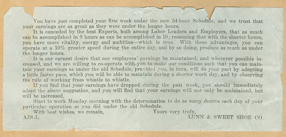 In late 1916, owners at the Lunn & Sweet Shoe company distributed this document in response to Maine's new 54 hour-a-week law. This law only applied to women and children under 16. The note reminds workers that they argued that a shortened work week would make them more productive. It states that they will not receive a pay cut if they can produce the same amount of shoes in 54 hours as they could in over 60 hours a week.