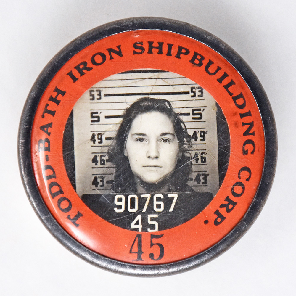 The woman featured on this Todd-Bath Shipyard security badge stares directly at the photographer. Looking closely at her expression, one can see the determination to succeed in a field of work formerly reserved for men.